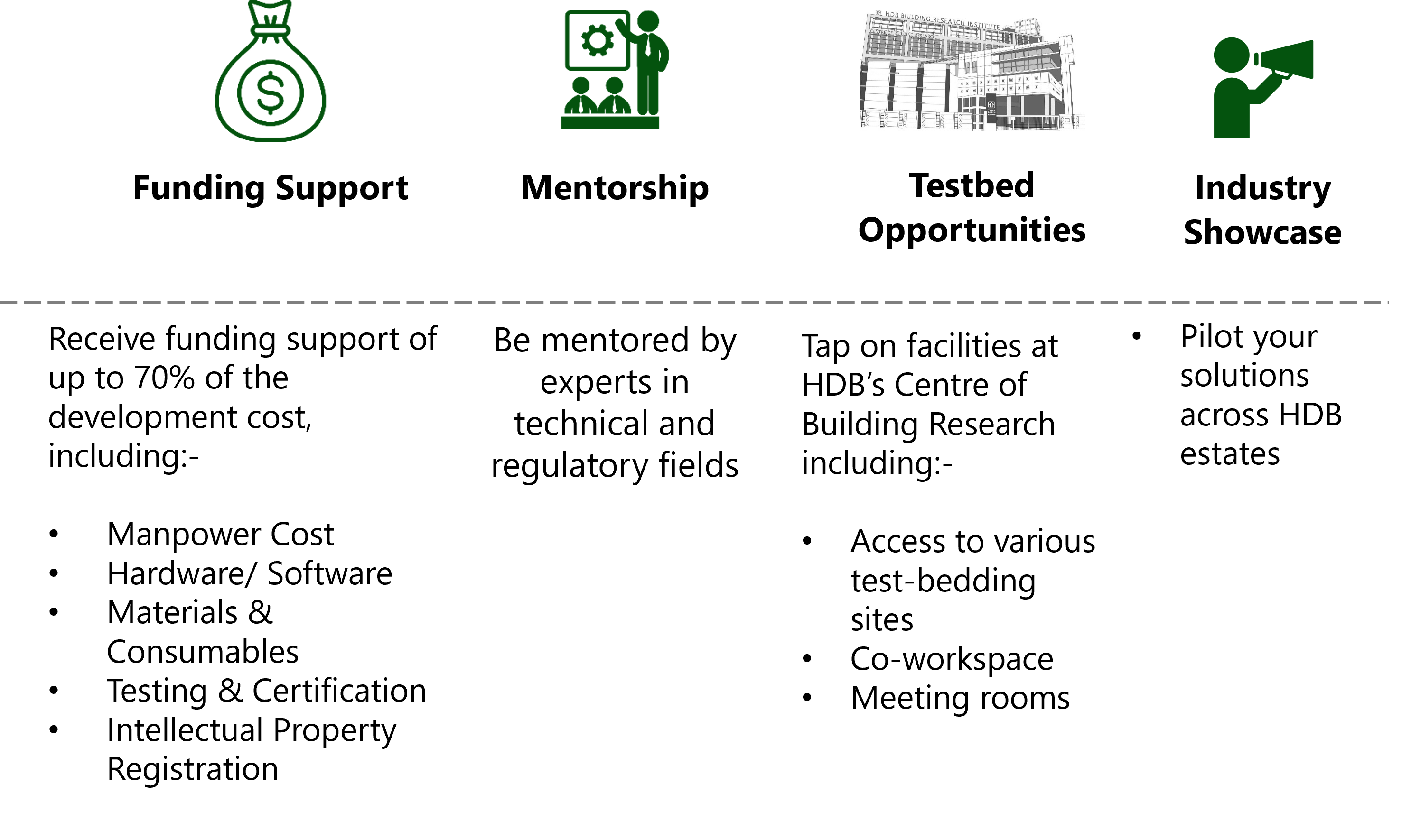 Cool Ideas Enterprise is an open innovation platform for innovators to co-develop solutions that improve the living environment and residents’ quality of life. We are looking for solutions in five focus areas – Energy, Urban Greenery, Living Environment, Water and Waste, and Building Technology – that can be piloted in our Living Labs island wide. Participants can benefit from funding support, mentorship, and access to facilities.